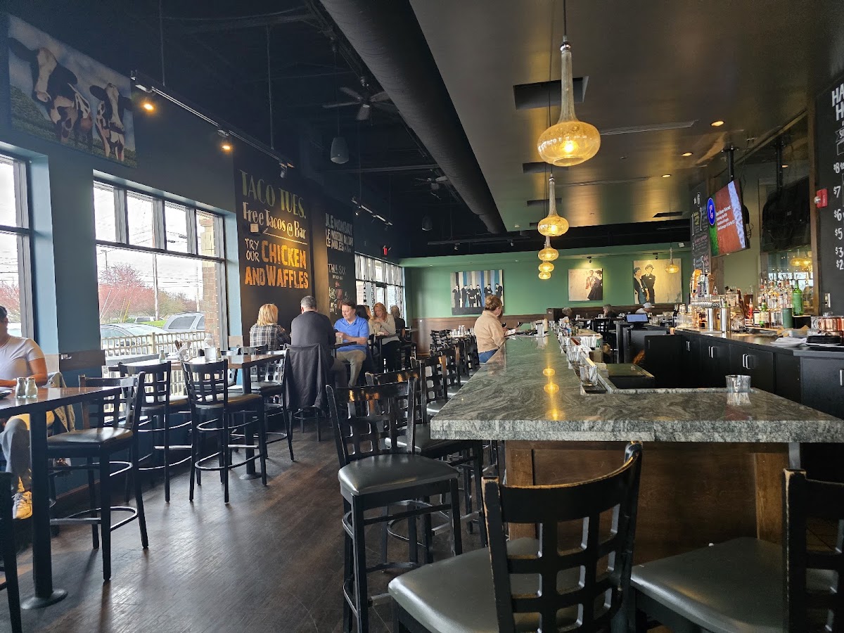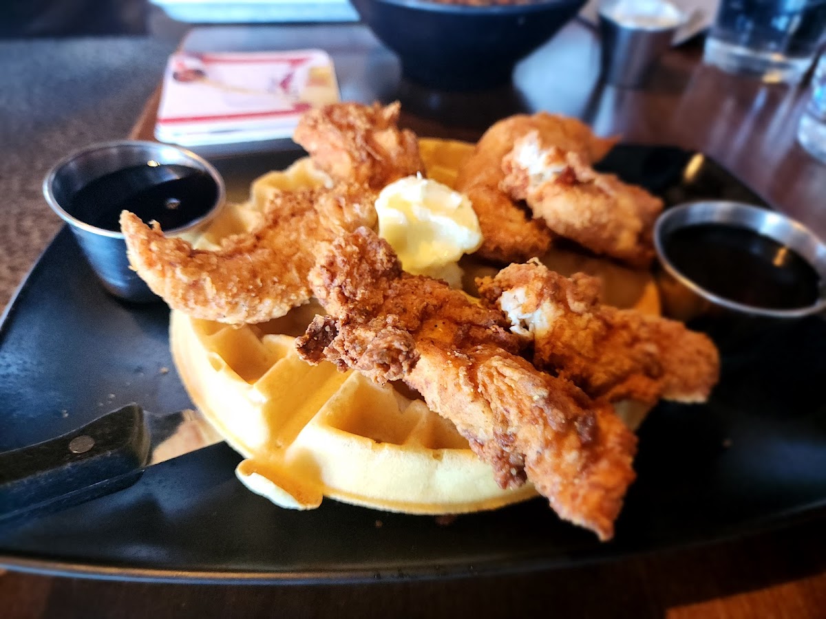 This restaurant is mostly good. The food ranged from good to great. The stand out was the short rib lo mein. The short rib in it had an incredible flavor. The dish was 10/10. The famous chicken and waffle are okay at best. The chicken tenders are dry the butter and syrup try to cover it up, but they're still dry, and it says the mable syrup is bourbon maple syrup. I could not taste any bourbon flavor in it. It just read as decent maple syrup. The waffle, however, was nice it was crisp and fluffy. But for it to be called famous I did expect more. The starter we had was decent with the pretzel board. They were incredibly light and delicate pretzels. The honey mustard works very well with them. The cheese is not as good but still paired well enough. The drink the bourbon thyme was pretty well balanced but still very citrus forward. My two main problems I had with our meal is 1 the 2 entrees did not remotely come out close together. The chicken and waffles were half eaten by the time the lo mein arrived. For an $80, I expect better timing. Another thing is that there is a 3% fee added to the meal. That they say on the bill is a fee due to increased service costs. Just raise your prices instead of hiding this fee till the end. There is a parking lot, and this place it seems like it would fill up fast on a busy night. We only waited like 10 minutes for a table around 2 pm on a Saturday.